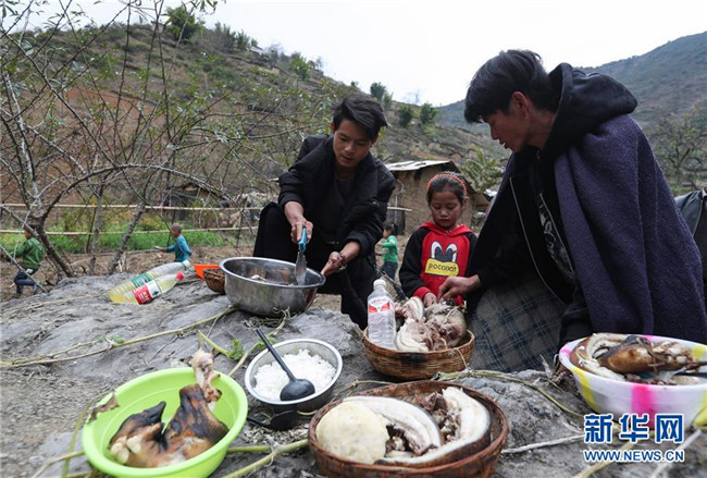 11月24日,在昭覺(jué)縣支爾莫鄉(xiāng)阿土列爾村,當(dāng)?shù)鼐用駵?zhǔn)備熟食、酒等食物祭祖,并相互贈(zèng)送。