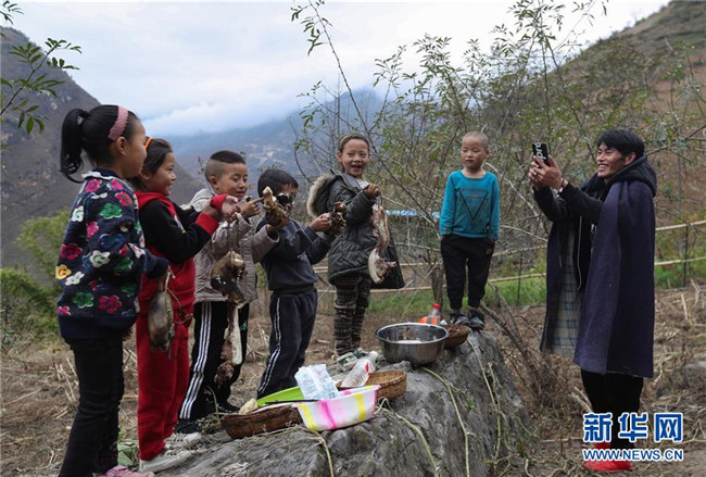 11月24日,在昭覺(jué)縣支爾莫鄉(xiāng)阿土列爾村,村民阿牛用手機(jī)拍攝孩子們向大家拜年的視頻。