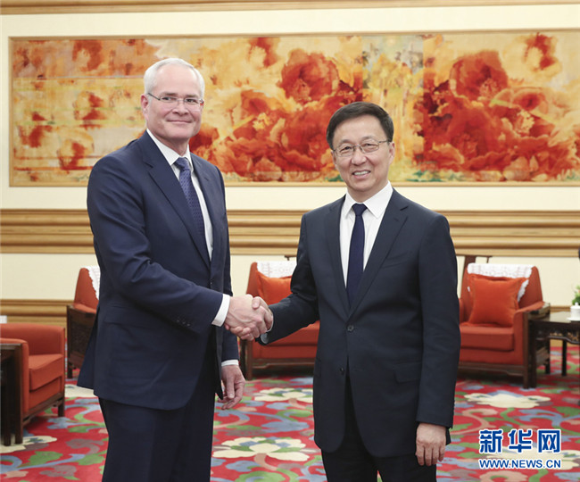 12月3日,中共中央政治局常委、國務(wù)院副總理韓正在北京中南海會見美國??松梨诠径麻L兼首席執(zhí)行官伍德倫。 新華社記者 丁海濤 攝