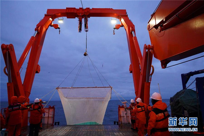 “雪龍2”號(hào)12月7日離開南大洋普里茲灣海域向西航行,開始對(duì)宇航員海海域展開科考作業(yè)。科考隊(duì)員沿著本次宇航員??瓶嫉氖讉€(gè)調(diào)查斷面,自北向南做了多個(gè)站位的CTD(海水溫鹽深測(cè)量?jī)x)采水作業(yè)、浮游生物垂直拖網(wǎng)作業(yè),以及魚類拖網(wǎng)和箱式采樣器等采樣作業(yè)。