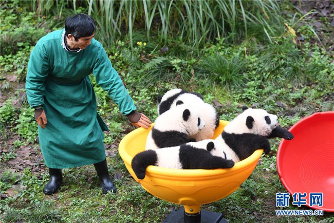 12月22日,飼養(yǎng)員引導(dǎo)大熊貓寶寶到戶外運動。當(dāng)日,重慶動物園為4只大熊貓寶寶“雙雙”“重重”“喜喜”“慶慶”舉行半歲生日慶?;顒?。4只半歲大熊貓在飼養(yǎng)員的照料下,在熊貓館運動場內(nèi)玩耍、嬉戲,與市民游客一同過冬至。新華社記者唐奕攝