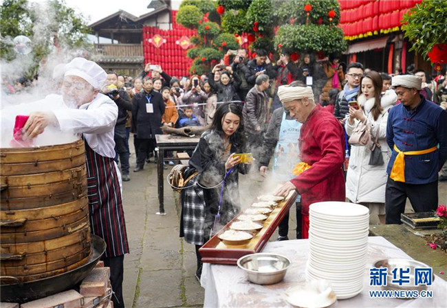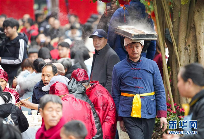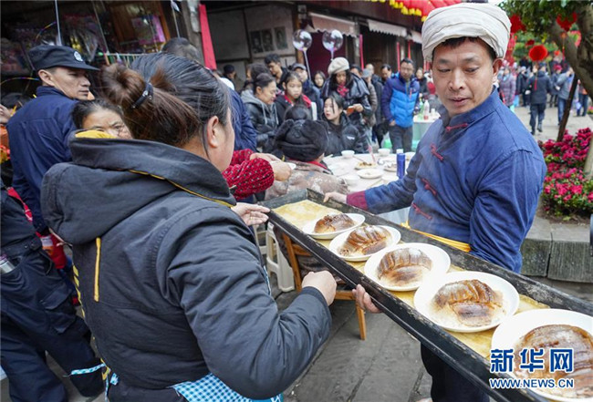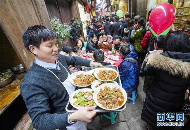 1月18日,在中山古鎮(zhèn)的“千米長宴”上,民間藝人用古鎮(zhèn)傳統(tǒng)“打盆”絕藝給游客們上菜。當日中午,伴隨著一聲“開席嘍”,一年一度的“千米長宴”在重慶市江津區(qū)中山古鎮(zhèn)舉行。噴香的煙熏豆腐、軟糯的夾燒肉、可口的石板糍粑……800余桌年味十足的特色美食,吸引了兩萬多名游客前來體驗傳統(tǒng)民俗,感受“一雙筷子吃遍一條街”的暢快淋漓。中山古鎮(zhèn)自古就有“千米匯長宴萬人祈福祉”的習俗。每年春節(jié)期間,古鎮(zhèn)老街居民都會在千米長街上大擺“百家宴”,祝福生意興隆、家業(yè)興旺、風調雨順、五谷豐登。新華社記者劉潺攝
