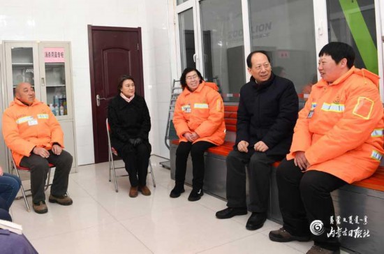 每逢節(jié)慶假日,往往是環(huán)衛(wèi)工人最忙最累的時候。石泰峰、布小林惦記著這些非常辛苦的勞動者,來到賽罕區(qū)環(huán)衛(wèi)局管理八所,向他們祝賀新年。在環(huán)衛(wèi)工人休息室,石泰峰、布小林與大家圍坐在一起親切交談,了解春節(jié)期間值班安排情況,仔細(xì)察看休息室及相關(guān)保障情況。石泰峰深情地說,環(huán)衛(wèi)工人是城市的“美容師”,你們一人勞累,換來萬人清潔,沒有你們的辛勤工作,就沒有城市環(huán)境的清潔美麗,也就沒有市民生活的安逸舒適,謝謝你們,給你們拜年了。