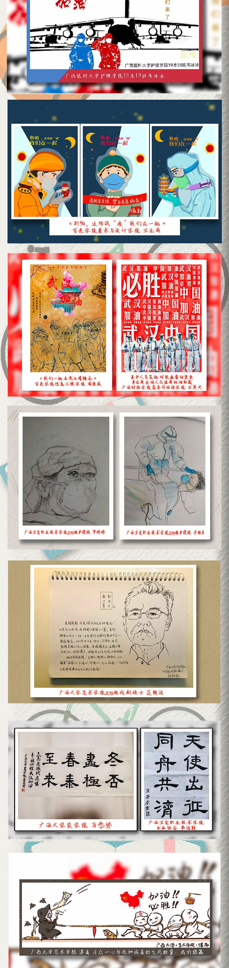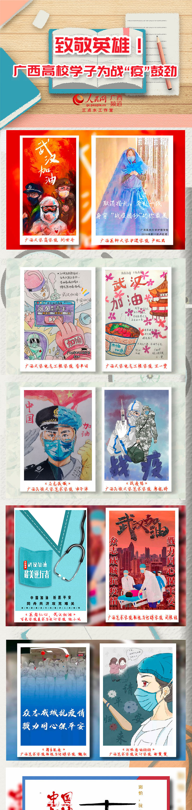 廣西各大高校的青年學(xué)子心系“疫”線,以抗擊疫情為主題創(chuàng)作了一批鼓舞人心的公益作品,向逆行英雄致敬,鼓勵人們積極樂觀面對疫情,以頑強意志、必勝信念打贏疫情阻擊戰(zhàn)。(彭遠賀、實習(xí)生溫嘉康)