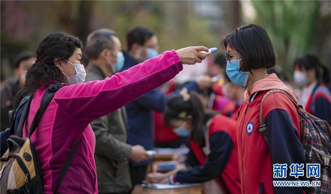 3月23日,昆明市第一中學(xué)工作人員為進(jìn)入校園的學(xué)生測(cè)量體溫。新華社記者 江文耀 攝