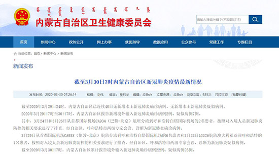 3月30日,記者從內(nèi)蒙古自治區(qū)衛(wèi)生健康委員會(huì)獲悉,截至2020年3月29日24時(shí),內(nèi)蒙古自治區(qū)已連續(xù)40日無新增本土新冠肺炎確診病例、無新增本土新冠肺炎疑似病例。