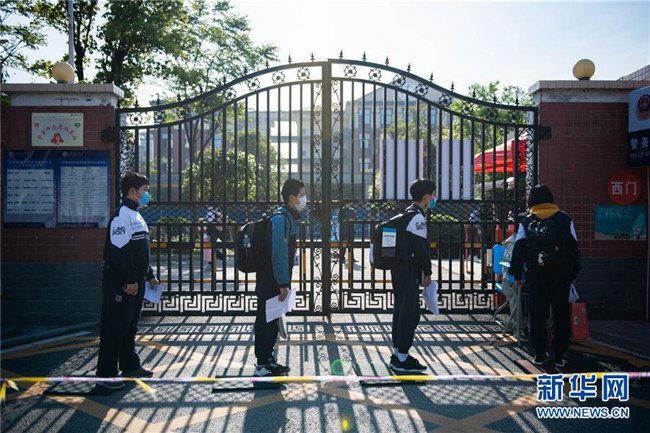 4月13日,在長沙寧鄉(xiāng)市長郡溈東中學(xué)門口,學(xué)生排隊進(jìn)入校園。新華社發(fā)(陳思汗 攝)