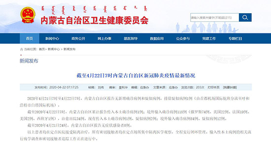 截至2020年4月21日24時,內(nèi)蒙古自治區(qū)報告無癥狀感染者0例。