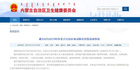 截至2020年4月23日7時,內蒙古自治區(qū)累計報告輸入本土確診病例1例;境外輸入確診病例118例(俄羅斯74例、英國22例、法國19例、美國2例、西班牙1例),治愈出院34例?,F(xiàn)有輸入本土確診病例1例、疑似病例2例;境外輸入確診病例84例、疑似病例5例。