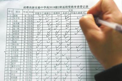 成都高新實(shí)驗(yàn)中學(xué)工作人員對高2018級2班學(xué)生進(jìn)行返校資格審查登記。