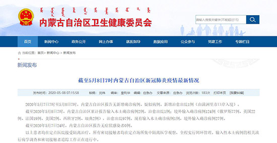 據(jù)內(nèi)蒙古自治區(qū)衛(wèi)生健康委員會(huì)5月8日發(fā)布的消息,2020年5月7日7時(shí)至5月8日7時(shí),內(nèi)蒙古自治區(qū)報(bào)告無新增確診病例、疑似病例。新增治愈出院1例(由滿洲里市口岸入境)。