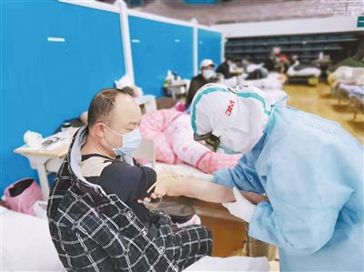 對(duì)于護(hù)理醫(yī)療隊(duì)的隊(duì)員們來(lái)說(shuō),在洪山體育館武昌方艙醫(yī)院的每一天,都是那么緊張。護(hù)理人員需快速對(duì)新入院的患者實(shí)施入院流程管理,觀察病情、監(jiān)測(cè)病人生命體征,及時(shí)將不適合入院的患者分診出轉(zhuǎn)至定點(diǎn)醫(yī)院;在為患者做好血氧監(jiān)測(cè)、體溫監(jiān)測(cè)等專(zhuān)科護(hù)理的同時(shí),還包攬了喂飯、喂藥、翻身、擦洗、換衣、大小便管理等各種貼身護(hù)理工作。這些看起來(lái)簡(jiǎn)單的工作,卻因?yàn)橐诜雷o(hù)服、口罩、護(hù)目鏡等防護(hù)裝備的層層包裹下進(jìn)行,變得異常吃力。最忙的時(shí)候,3個(gè)護(hù)士要同時(shí)護(hù)理82名患者,但隊(duì)員們憑著自身過(guò)硬的護(hù)理經(jīng)驗(yàn),攻克了一個(gè)又一個(gè)難關(guān)。