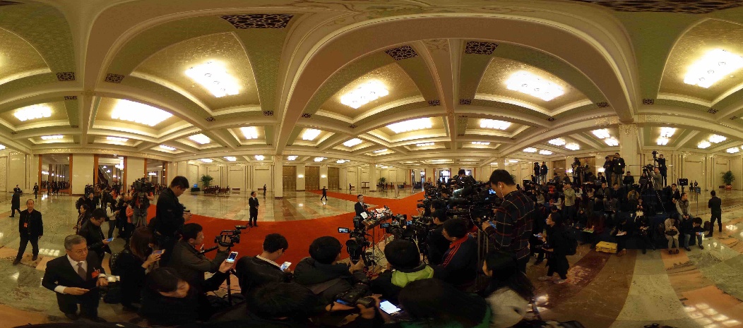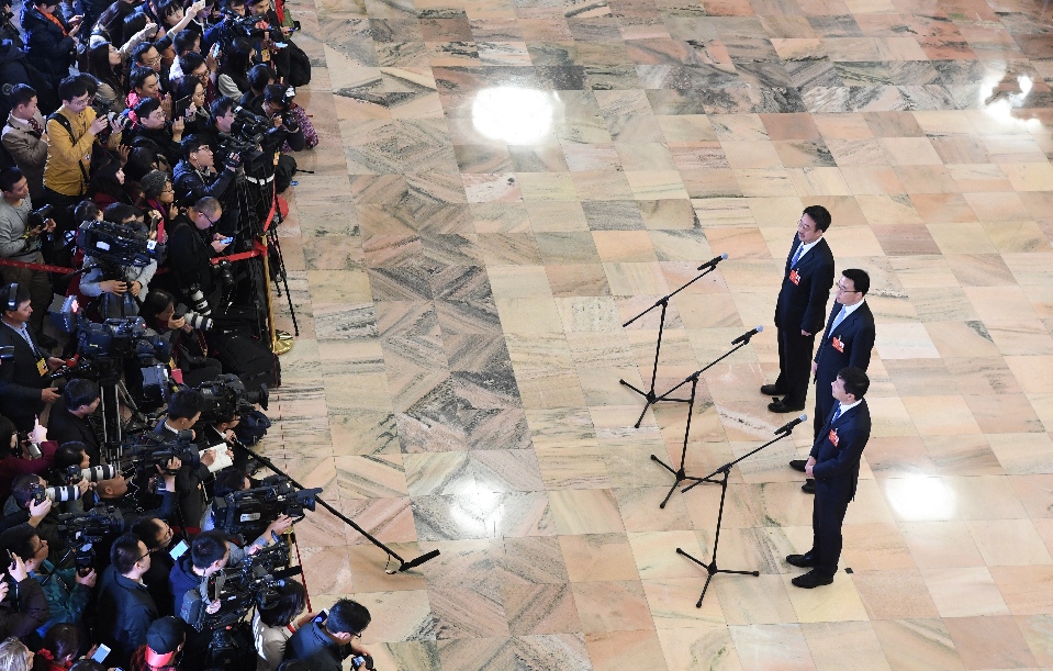 2018年3月20日,十三屆全國人大一次會議在北京人民大會堂舉行閉幕會。這次全國兩會首設“代表通道”,圖為記者在“代表通道”采訪。