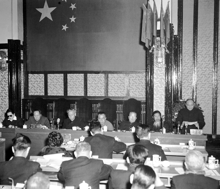 1953年2月11日,中央人民政府委員會舉行第二十二次會議。鄧小平(右一)在會議上作關于中華人民共和國全國人民代表大會及地方各級人民代表大會選舉法的說明報告。主席臺上(自左起)宋慶齡副主席,毛澤東主席,劉少奇、朱德、李濟深、張瀾副主席。