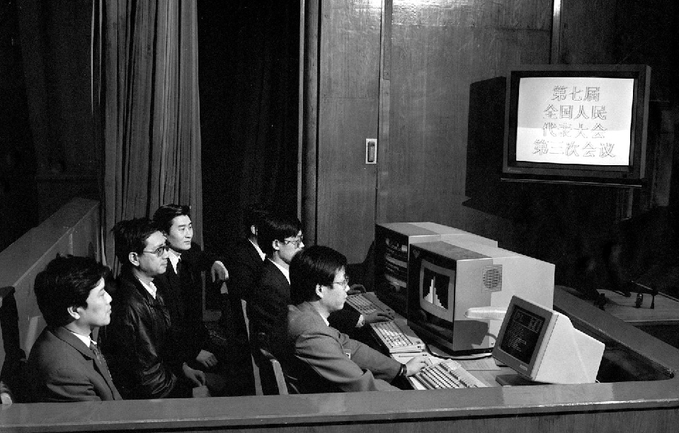 1990年3月,工作人員在七屆全國人大三次會議上監(jiān)視電子表決系統(tǒng)的運轉情況。這套電子表決系統(tǒng)有報到、表決和即席發(fā)言3種功能。這是首次啟用電子表決器。