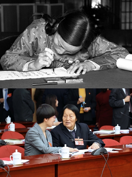 申紀蘭用她半生時間見證了中國民主法制建設的進程。上圖為出席第一屆全國人民代表大會第一次會議的人大代表申紀蘭在報到(1954年9月攝);下圖為她(右)在十三屆全國人大二次會議山西代表團會議間隙與青年代表交流(2019年3月攝)。
