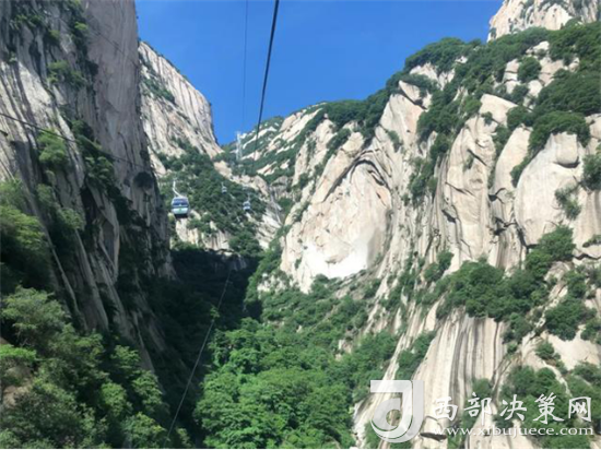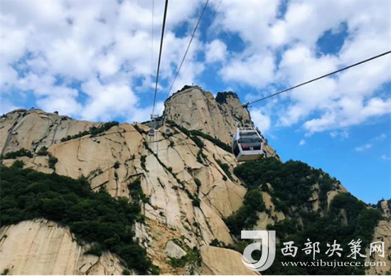 華山西線索道是迄今為止世界上第一條采取崖壁開鑿硐室站房、起伏式走向、設(shè)中間站的單線循環(huán)脫掛式索道,索道設(shè)備自法國引進,采取全程數(shù)字自動化控制系統(tǒng),達世界一流水平。索道下站設(shè)在甕峪內(nèi)東溝口,中間站設(shè)在仙峪白雀寺,上站設(shè)在華山西峰巨靈足南側(cè)下絕壁洞室內(nèi)。索道線路斜長4211米,相對高差894米,支架28個,客運吊廂84個,吊廂間距為115米,每廂可乘8人,運行速度最快6米/秒,單向運量1500人/小時。