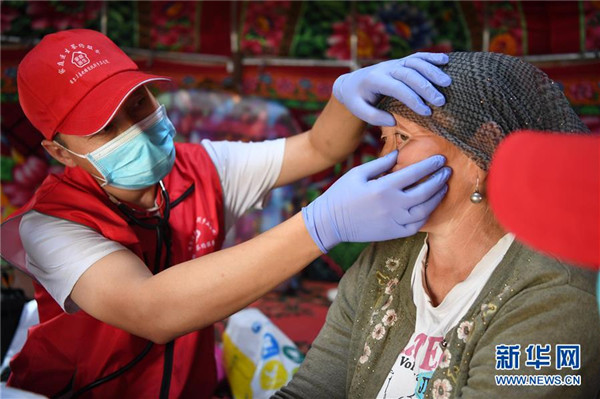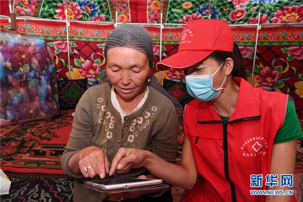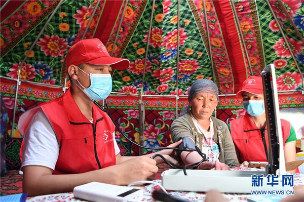 6月20日,新疆阿勒泰地區(qū)布爾津縣也格孜托別鄉(xiāng)克孜勒托蓋村村醫(yī)在布爾津縣黑流灘草原給牧民巴合提古麗·塔拉甫汗檢查身體。圍繞實現(xiàn)人人享有基本醫(yī)療衛(wèi)生服務(wù)目標,2016年起,新疆布爾津縣開展家庭醫(yī)生簽約服務(wù)工作。該縣組建家庭醫(yī)生簽約團隊65個,團隊醫(yī)務(wù)人員233名,通過手機APP、基本公衛(wèi)系統(tǒng)與全縣建檔立卡貧困戶進行電子化簽約,提升村醫(yī)隨訪的工作效率和質(zhì)量。截至目前,已完成簽約42936人,履約40043人。新華社記者沙達提攝