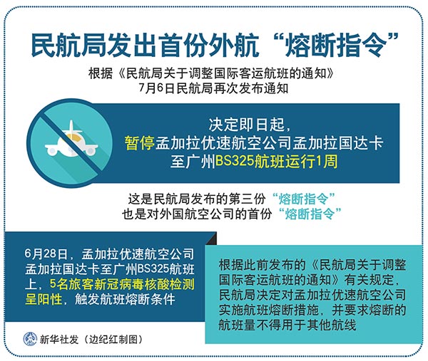 根據(jù)此前發(fā)布的《民航局關(guān)于調(diào)整國際客運(yùn)航班的通知》有關(guān)規(guī)定,民航局決定對(duì)孟加拉優(yōu)速航空公司實(shí)施航班熔斷措施,并要求熔斷的航班量不得用于其他航線。(記者齊中熙)