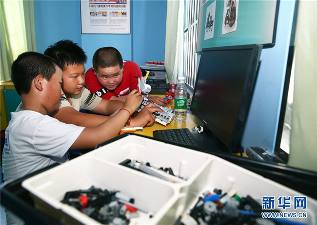 7月22日,學生在石嘴山市大武口區(qū)青少年學生校外活動中心活動室內(nèi)一起學習組裝機器人。新華社記者 賈浩成 攝