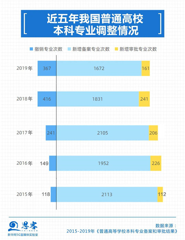 4近五年我國普通高校本科專業(yè)調(diào)整情況 近年來,隨著經(jīng)濟(jì)社會(huì)的不斷發(fā)展,高校的專業(yè)設(shè)置也在不斷更迭,可供選擇的專業(yè)也越來越多。2015年開始,全國高校每年增設(shè)專業(yè)數(shù)量在2000個(gè)左右,撤銷專業(yè)的數(shù)量也超過100個(gè)。