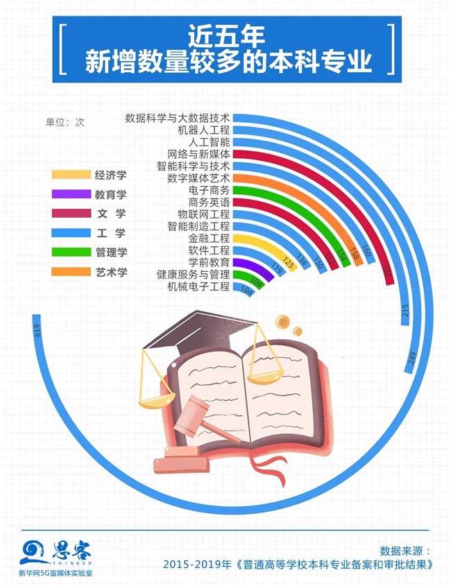 工學(xué)新增專業(yè)數(shù)量遙遙領(lǐng)先。數(shù)據(jù)顯示,近五年新增數(shù)量較多的數(shù)據(jù)科學(xué)與大數(shù)據(jù)技術(shù)、機(jī)器人工程和人工智能等專業(yè)都屬于工學(xué)。這些專業(yè)也是特設(shè)專業(yè)(專業(yè)代碼后加T表示),根據(jù)高校的辦學(xué)特色或者是近幾年來人才的培養(yǎng)特殊需求設(shè)置。與每五年調(diào)整一次的基本專業(yè)不同,特設(shè)專業(yè)可以每年調(diào)整一次,兩種特性的專業(yè)可以分別管理。