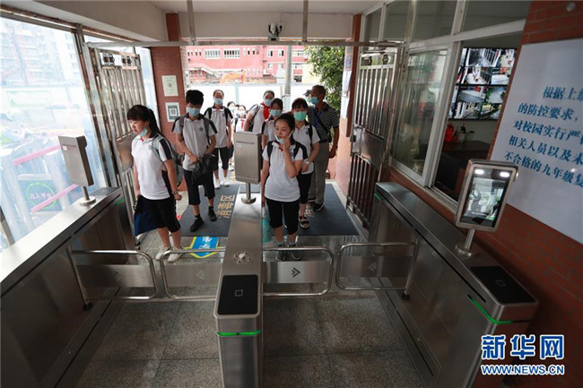 8月10日,在位于武漢的湖北省水果湖一中,初一、初二年級學(xué)生通過測溫通道入校。