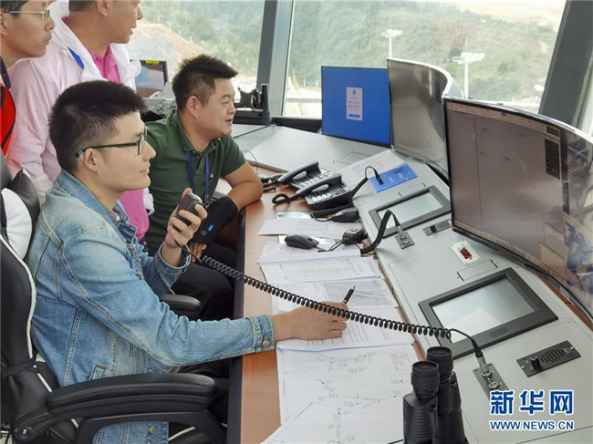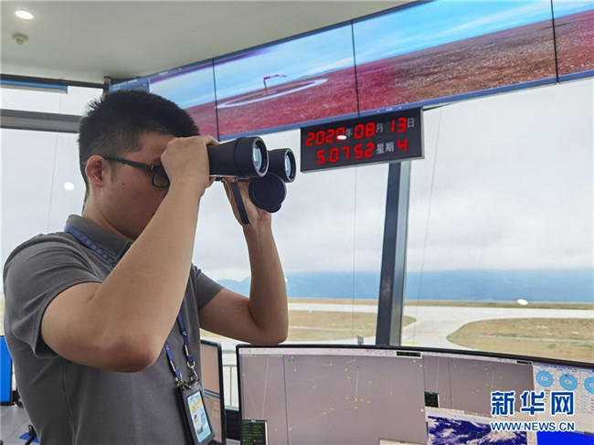 8月13日,參加校飛的地面工作人員在仙女山機場的塔臺工作區(qū)內(nèi)工作。新華社記者 劉潺 攝