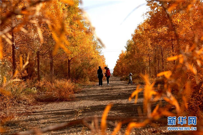 10月10日,游客在甘肅省敦煌市莫高鎮(zhèn)的胡楊林中游玩。 金秋十月,甘肅省敦煌市莫高鎮(zhèn)的胡楊林盡染秋色,美不勝收。 新華社發(fā)(張曉亮 攝)