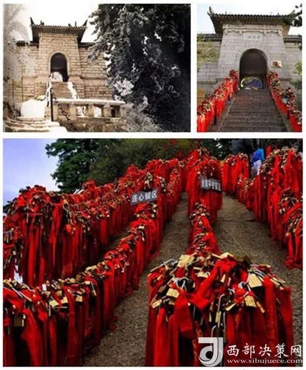 到達(dá)金鎖關(guān)時(shí),眼前大片大片的紅色,游人的視覺和心靈受到強(qiáng)烈的沖擊。這是沿路兩邊鐵鏈上綁滿的密密麻麻的紅色絲繩,不留一絲空隙,風(fēng)吹來,長(zhǎng)長(zhǎng)的紅色絲繩就輕盈的舞起來,如愛情牢固的臂膀,甜蜜的飛翔在華山之上。讓一把感情鎖和華山一同到地老天荒,成為一個(gè)“山無陵,天地絕,乃敢與君絕”的千古情愛神話。