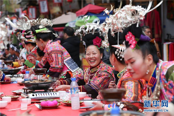 10月18日,苗族群眾在貴州省丹寨縣萬(wàn)達(dá)小鎮(zhèn)吃新節(jié)長(zhǎng)桌宴上品嘗佳肴。當(dāng)日,貴州省黔東南苗族侗族自治州丹寨縣萬(wàn)達(dá)小鎮(zhèn)舉辦苗族吃新節(jié)體驗(yàn)活動(dòng)。當(dāng)?shù)孛缱逋J笙舞、品長(zhǎng)桌宴,并邀請(qǐng)游客參與其中,大家在歡聲笑語(yǔ)中樂(lè)享金秋。新華社發(fā)(凱尚宇攝)
