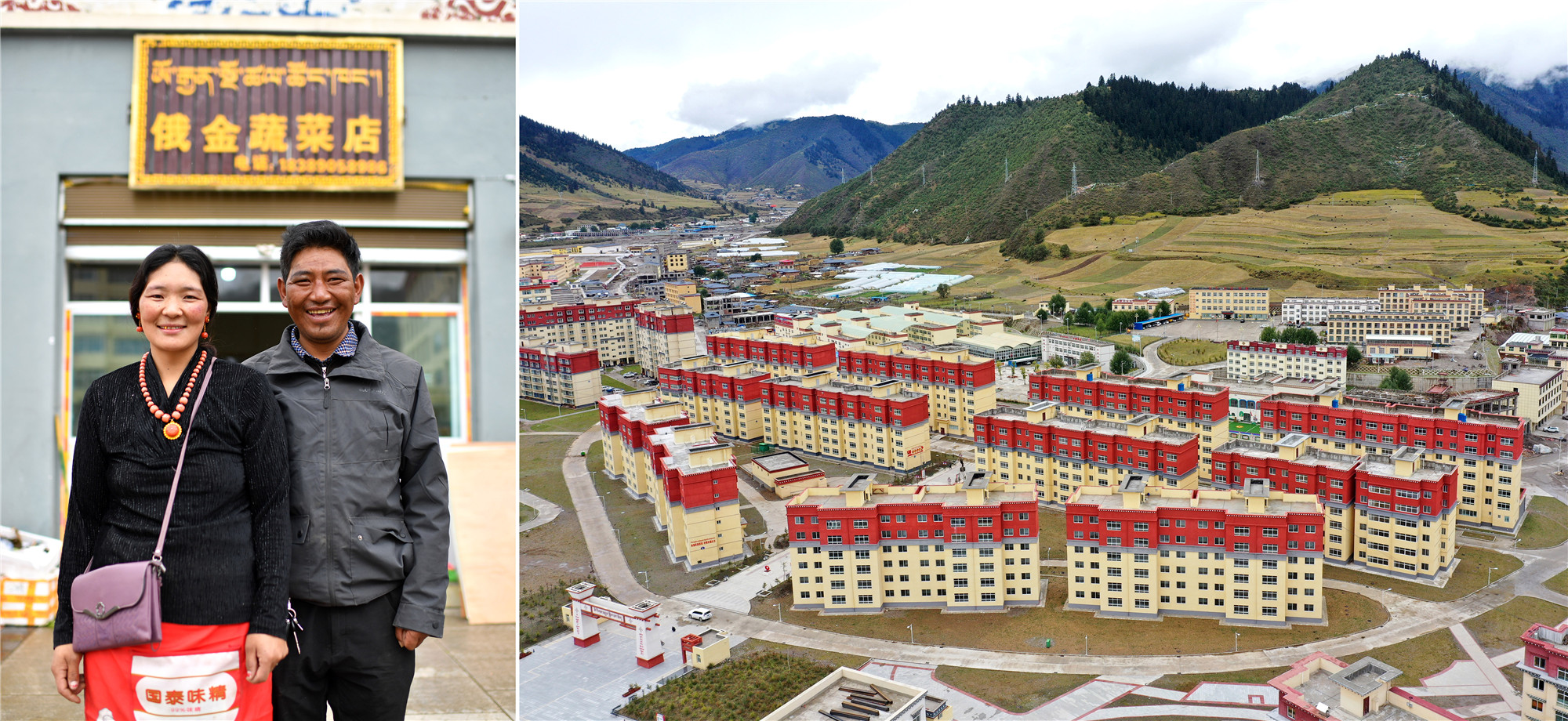 2020年9月22日拍攝的拼版照片:左圖為西藏自治區(qū)昌都市類烏齊縣長(zhǎng)毛嶺鄉(xiāng)達(dá)雄村村民俄金(右)和妻子阿丁在安置點(diǎn)俄金蔬菜店前;右圖為類烏齊縣桑多扶貧開發(fā)區(qū)易地扶貧搬遷安置點(diǎn)一角(無人機(jī)照片)。新華社記者 詹彥 攝