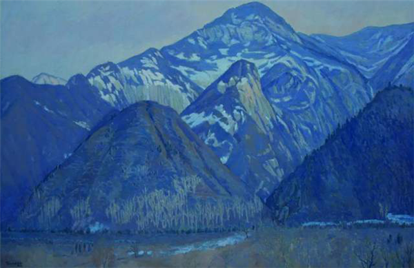 作品《神屏》,始于2013年春季寫(xiě)生,東仰太華的清晨,主峰巍峨,山谷靜悄悄的,逆光下的高山統(tǒng)一在多層次的藍(lán)色調(diào)里,復(fù)雜的山石結(jié)構(gòu)則需要反反復(fù)復(fù)耐心的修改塑造,畫(huà)長(zhǎng)三米九,高兩米。