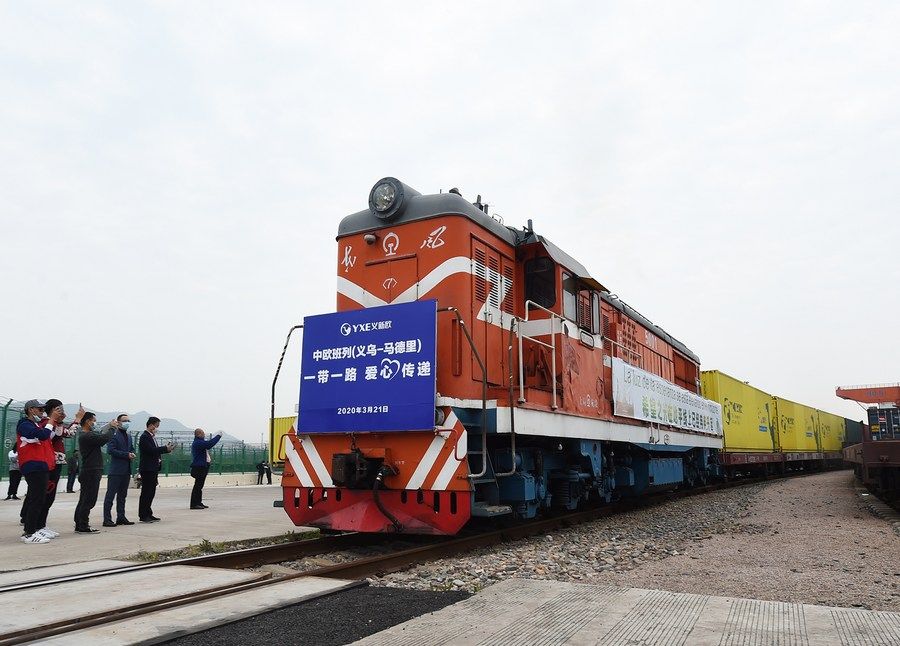 2020年3月21日,載著捐贈西班牙抗疫物資的“義新歐”中歐班列(義烏—馬德里)從義烏鐵路西站發(fā)車,前往馬德里。 新華社發(fā)(龔獻明 攝)