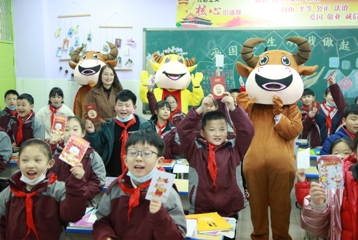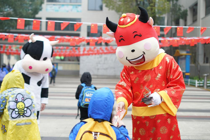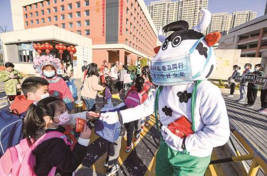 2月21日,南京市江寧開發(fā)區(qū)學(xué)校一老師打扮成“福氣牛”,在校園門口為孩子們送上裝有口罩、新年祝福和防疫小貼士的“紅包”。邵丹 攝