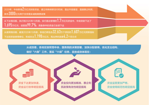 今年3月初,財政部調(diào)研小組發(fā)布的《2020年中國財政政策執(zhí)行情況報告》顯示,直達資金執(zhí)行情況總體良好,“僅用20天時間,就將95%的中央直達資金下達市縣基層,省級財政細化下達時間平均只有1周,速度前所未有。”“目前,財政直達資金預算下達已經(jīng)完成,其中1.56萬億元資金已經(jīng)投入使用,預算執(zhí)行情況總體良好,重點領域支出保障有力,效果明顯。”