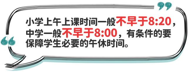三、統(tǒng)籌安排學校作息時間。省級教育行政部門要從保證學生充足睡眠需要出發(fā),結合實際情況合理確定中小學作息時間。小學上午上課時間一般不早于8:20,中學一般不早于8:00;學校不得要求學生提前到校參加統(tǒng)一的教育教學活動,對于個別因家庭特殊情況提前到校學生,學校應提前開門、妥善安置;合理安排課間休息和下午上課時間,有條件的地方和學校應保障學生必要的午休時間;寄宿制學校要合理安排作息時間,確保學生達到規(guī)定睡眠時間要求。