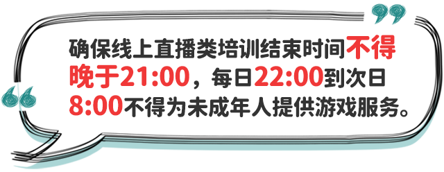 五、合理安排學生就寢時間。中小學校要指導家長和學生,制訂學生作息時間表,在保證學生睡眠時間要求前提下,結合學生個體睡眠狀況、午休時間等實際,合理確定學生晚上就寢時間,促進學生自主管理、規(guī)律作息、按時就寢。小學生就寢時間一般不晚于21:20;初中生一般不晚于22:00;高中生一般不晚于23:00。個別學生經努力到就寢時間仍未完成作業(yè)的,家長應督促按時就寢不熬夜,確保充足睡眠;教師應有針對性幫助學生分析原因,加強學業(yè)輔導,提出改進策略,如有必要可調整作業(yè)內容和作業(yè)量。各地教育部門要會同相關部門切實加強對轄區(qū)內注冊登記或備案的線上培訓網課平臺、網絡游戲的規(guī)范管理,采取技術手段進行監(jiān)管,確保線上直播類培訓活動結束時間不得晚于21:00,每日22:00到次日8:00不得為未成年人提供游戲服務。