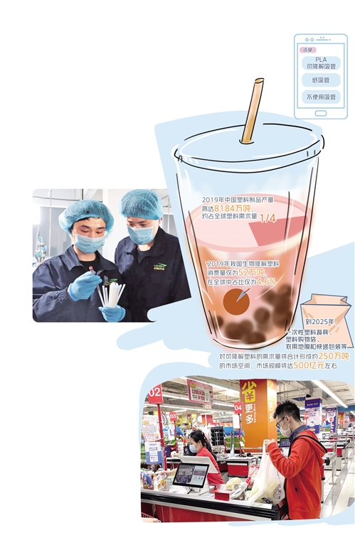 不過,這也意味著潛在的市場缺口亟待補(bǔ)足。據(jù)測算,到2025年,一次性塑料餐具、塑料購物袋、農(nóng)用地膜和快遞包裝四個領(lǐng)域?qū)山到馑芰系男枨罅繉⒑嫌?jì)形成約250萬噸的市場空間,市場規(guī)模將達(dá)500億元左右。