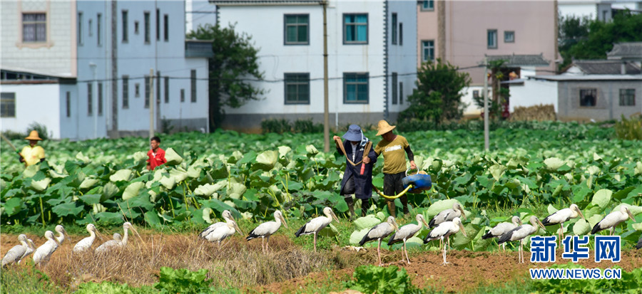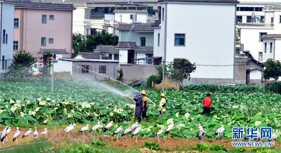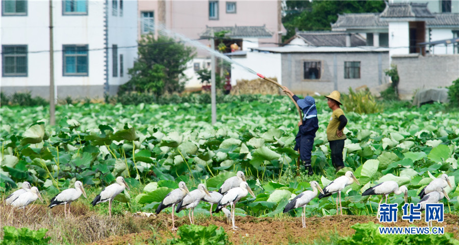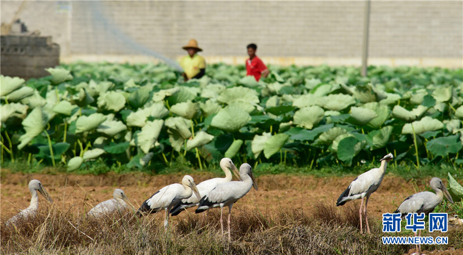 近日,云南省彌勒市竹園鎮(zhèn)農民在荷田間勞作,不遠處許多鉗嘴鸛在田邊地頭棲息覓食,一幅人鳥和諧的生態(tài)畫卷徐徐展開。2006年,中國在云南大理首次記錄到鉗嘴鸛。近年來,隨著生態(tài)環(huán)境不斷改善,云南多地均發(fā)現鉗嘴鸛。新華網發(fā)(普佳勇攝影報道)