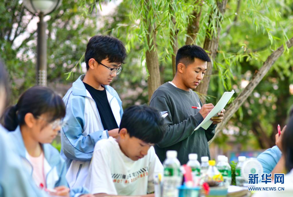 記者在這個(gè)特殊的“帳篷課堂”看到,學(xué)生們有的正在集中做著卷子,有的在復(fù)習(xí)課文,老師在一旁耐心講解。遠(yuǎn)處,空置的教學(xué)樓懸掛著條幅,上面寫著“用拼搏的汗水灌注無悔的高三路 考前不怕 考后不悔”。