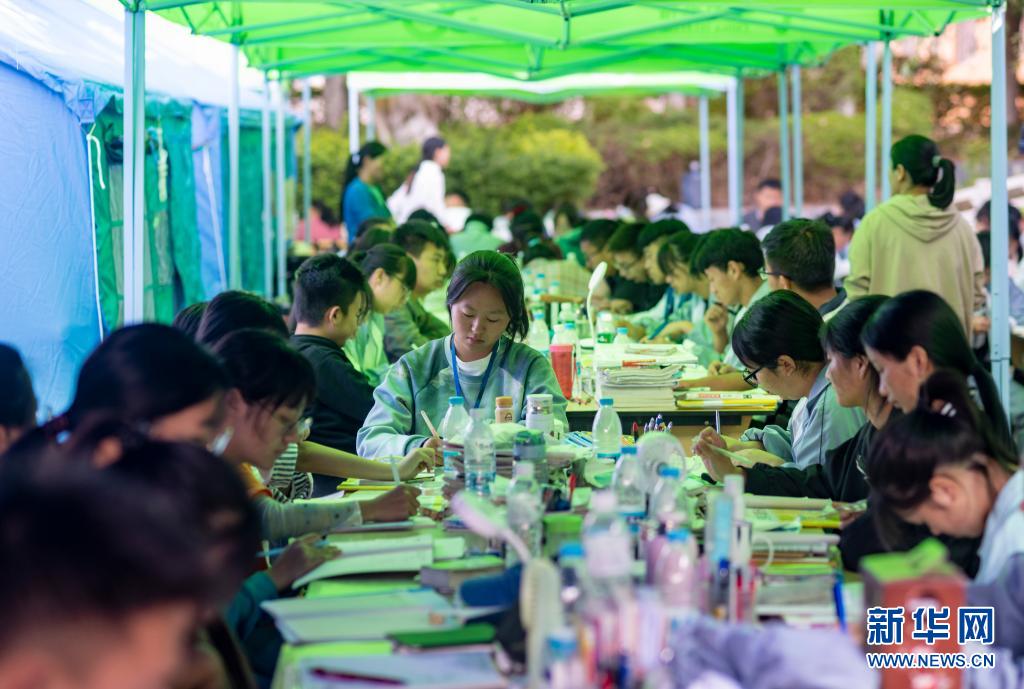 5月24日,漾濞一中高三年級(jí)學(xué)生在帳篷下學(xué)習(xí)。新華社記者陳欣波攝