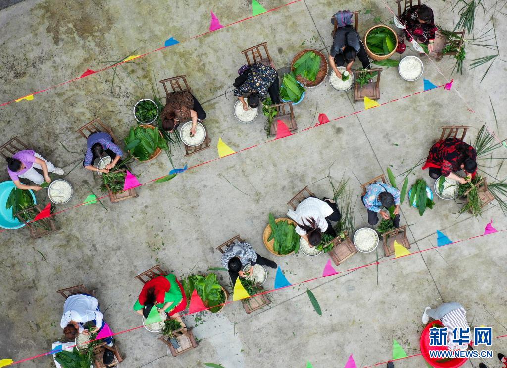 6月2日,貴州省銅仁市玉屏侗族自治縣亞魚鄉(xiāng)郭家灣村村民參加包粽子比賽。新華社發(fā)(胡攀學攝)