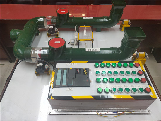 該模型由監(jiān)控系統(tǒng)和風機主體兩部分構(gòu)成,監(jiān)控系統(tǒng)由PLC柜中的S7-300PLC模塊及電腦組成,風機主體利用PVC管材制作的風筒以及小電機組成。不僅可滿足實操培訓教學,同時還可進行模擬故障情況下的倒機操作,能有效提高主扇司機的操作技能,為公司礦井通風系統(tǒng)的安全穩(wěn)定運行多了一層保障。