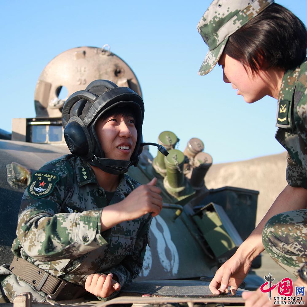 新疆軍區(qū)某合成團坦克二連政治指導員馬和帕麗(右一)組織戰(zhàn)術(shù)訓練的情景。袁凱 攝