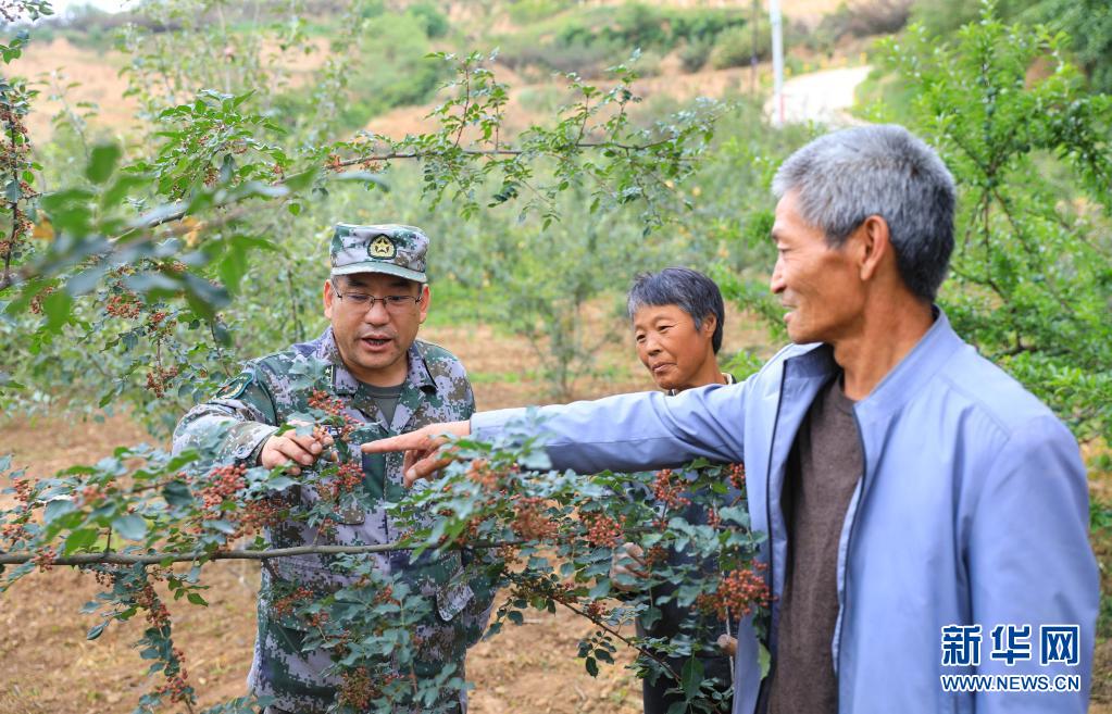 張洪峰(左)深入田間地頭了解花椒價格,和群眾一起探討花椒培育技術(shù)(2020年7月10日攝)。新華社發(fā)(張仲海 攝)