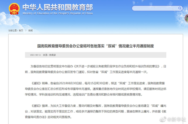 記者11日從教育部網(wǎng)站獲悉,國務院教育督導委員會辦公室日前印發(fā)專門通知,擬對各省“雙減”工作落實進度每半月通報一次。據(jù)悉,各省自2021年8月30日起,每月15日和30日前,報送“雙減”工作落實進度,國務院教育督導委員會辦公室在匯總分析后形成專項督導半月通報。通報重點是各地作業(yè)時間達標學校情況、課后服務時間達標學校情況、學科類培訓機構壓減情況、違規(guī)培訓廣告查處情況和群眾舉報問題線索核查情況等。(記者王鵬)