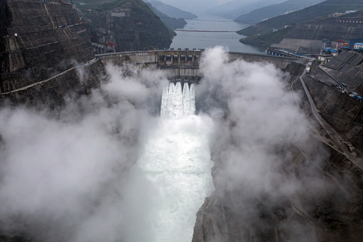 投產(chǎn)發(fā)電中的白鶴灘水電站(無(wú)人機(jī)照片)。新華社記者 江文耀 攝