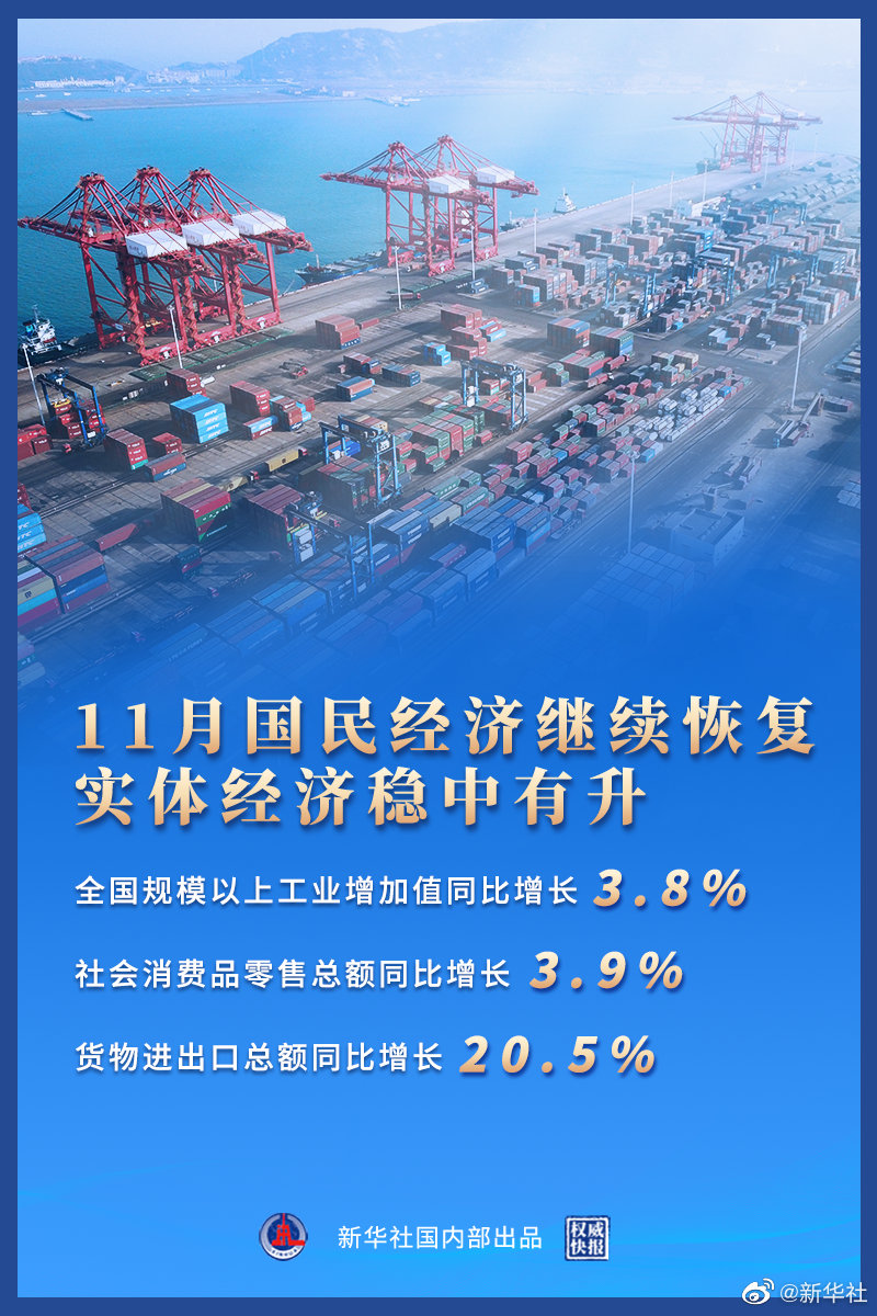 國家統(tǒng)計局15日發(fā)布的數(shù)據(jù)顯示,11月份,全國規(guī)模以上工業(yè)增加值同比增長3.8%,兩年平均增長5.4%;社會消費(fèi)品零售總額41043億元,同比增長3.9%,兩年平均增長4.4%;貨物進(jìn)出口總額37164億元,同比增長20.5%。國民經(jīng)濟(jì)繼續(xù)保持恢復(fù)態(tài)勢,發(fā)展韌性不斷增強(qiáng)。(記者魏玉坤、鄒多為,海報設(shè)計楊軼群)