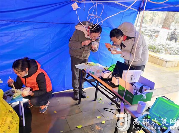 正當(dāng)隊員們準(zhǔn)備修整一天時,新的命令到了,要求醫(yī)療隊安排300名隊員支援雁塔區(qū)核酸采集工作,大家毫無怨言,坐上了趕赴雁塔區(qū)的大巴。這是最不尋常的一天,醫(yī)療隊承擔(dān)了雁塔區(qū)近10個居民區(qū)的核酸采樣任務(wù),且大部分都屬于封控區(qū)。核算采樣需上門采集,風(fēng)險大、難度高,因為信息采集設(shè)備無法上樓,只能依靠人工信息錄入,隊員們身穿防護服,在操作極其困難的情況下做到了不漏一戶,不落一人。采集結(jié)束已是25日凌晨1點,來自漢臺區(qū)的余晗和趙凌最后的采集任務(wù)已是凌晨2點,此時的千年古都正飄落著冬日的雪花。這次入戶采集共完成49081人次。